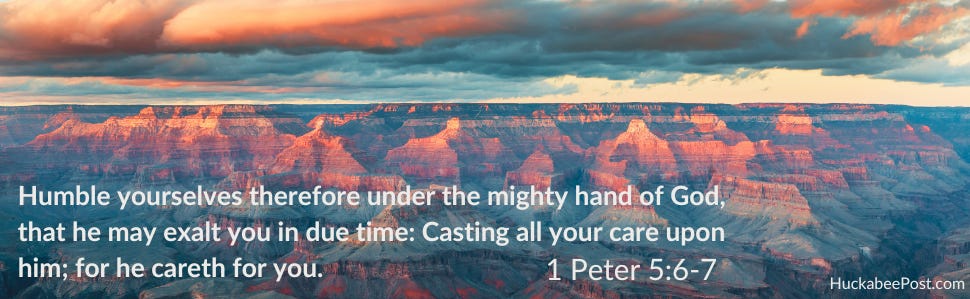 6 Humble yourselves therefore under the mighty hand of God, that he may exalt you in due time: Casting all your care upon him; for he careth for you. - 1 Peter 5:6-7 KJV