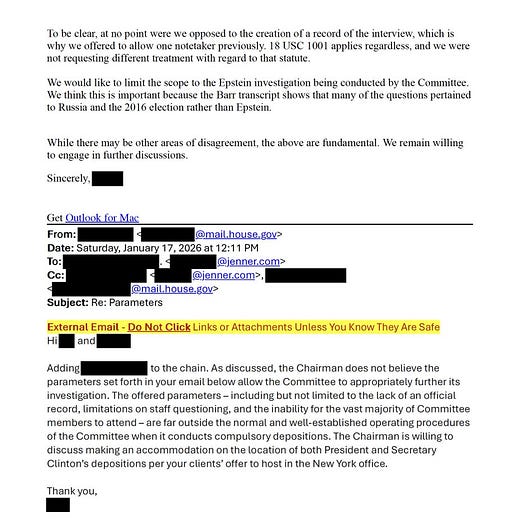Also, the Oversight Committee responded to Urena’s post on X, saying, “One of the Clinton’s pawns [as in, Urena] claimed to the fake NYT that they never ruled out a transcript. The receipts tell a different story --- they demanded that there be only one staffer “to take notes” for each side during an ‘interview.’ Subpoenas and depositions are not suggestions.”