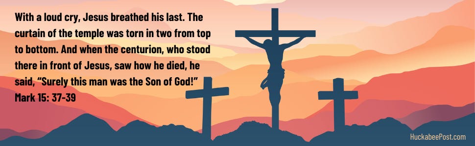 38 The curtain of the temple was torn in two from top to bottom. 39 And when the centurion, who stood there in front of Jesus, saw how he died,[a] he said, “Surely this man was the Son of God!” Mark 15:37-39