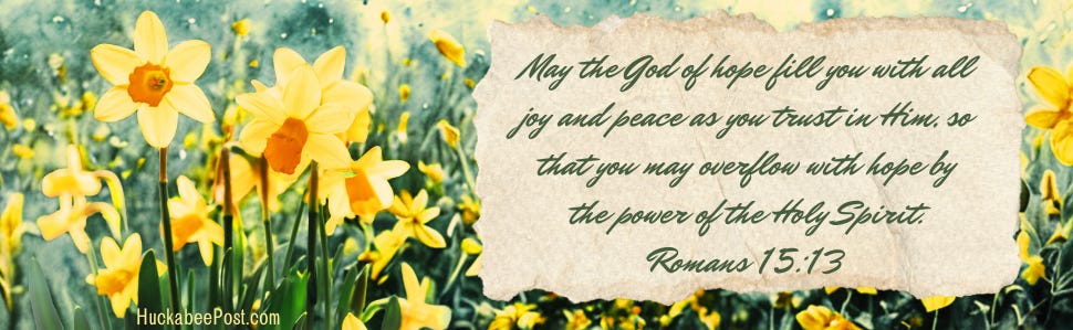 May the God of hope fill you with all joy and peace as you trust in Him, so that you may overflow with hope by the power of the Holy Spirit. - Romans 15:3